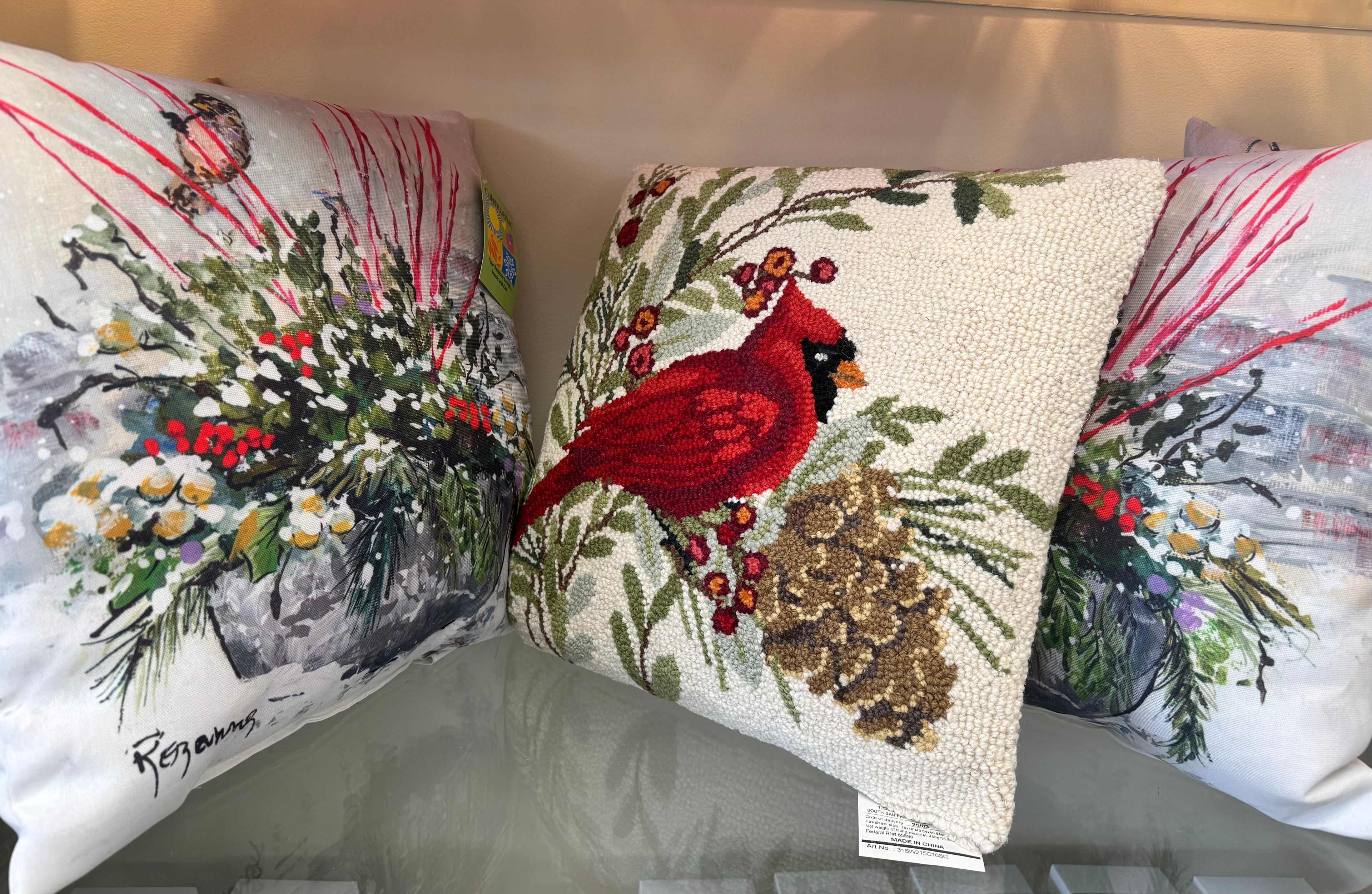Holiday pillows add a quick “pop” of color and festivity to a room.